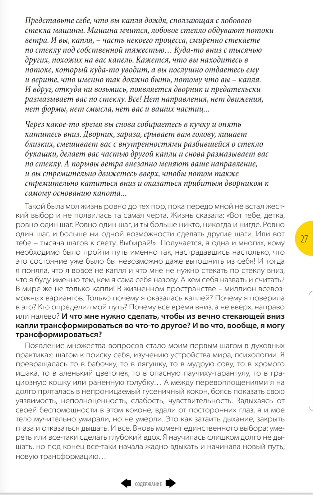 И тогда, я поняла, что я вовсе не капля. И что мне не нужно стекать по стеклу вниз. Что я буду именно тем, кем я сама себя назову. А кем себя назвать и считать? В мире же не только капли! Там миллион всевозможных вариантов в пространстве жизни. Только почему я оказалась каплей? Почему я поверила в это? Кто определил мой путь? Почему все время вниз, а не вверх, направо или налево? И что мне нужно сделать, чтобы из вечно стекающей вниз капли трансформироваться во что -то другое? И во что вообще я могу трансформироваться?